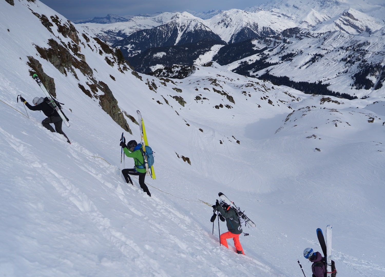 Cette formation s’adressait aussi bien aux pratiquants néophytes qu’à ceux disposant déjà d’une expérience plus affirmée. Les contenus et retours d’expérience apportés par les encadrants variaient donc selon les groupes constitués, tout en s’appuyant sur deux ateliers techniques communs : l’un consacré à la recherche de DVA, en partenariat avec Innov’Pro Avalanche, et l’autre dédié au portage des skis et à la remontée d’un goulet équipé d’une main courante. La seconde journée a été davantage orientée vers la randonnée, avec des itinéraires variés autour du Grand Mont et d’autres sommets emblématiques du Beaufortain.